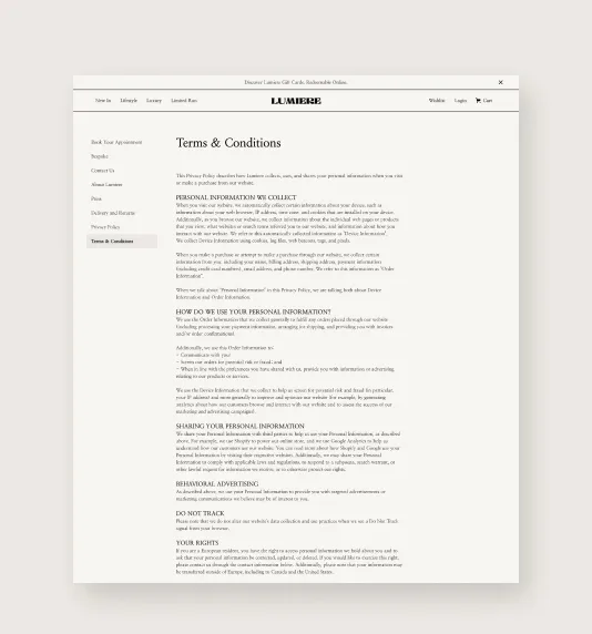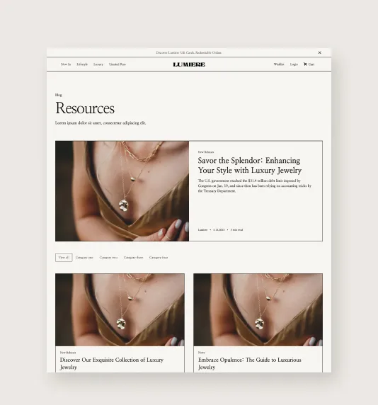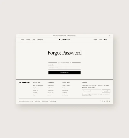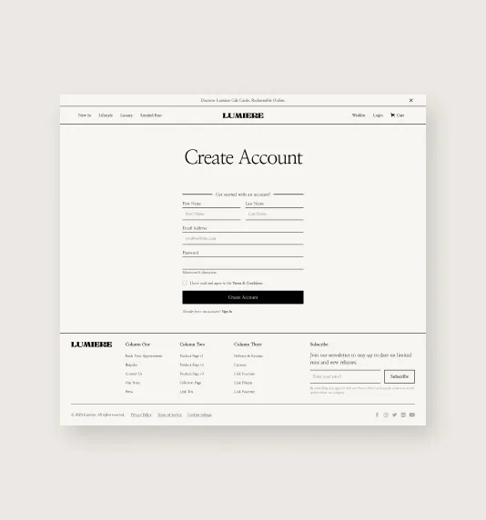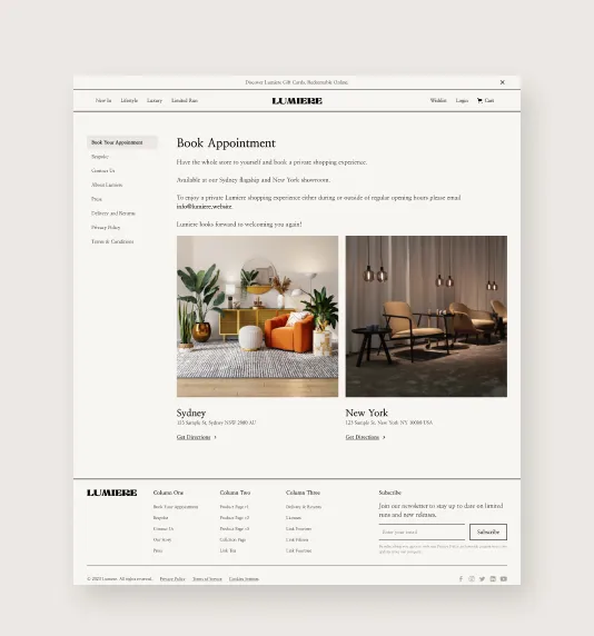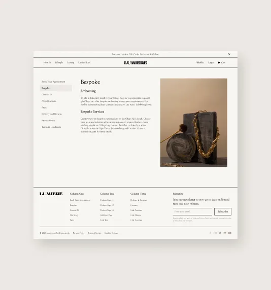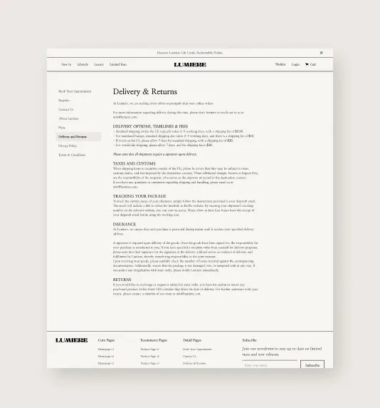 Lumiere comes out of the box with all the pages that you are likely to need when building out a luxury ecommerce website.